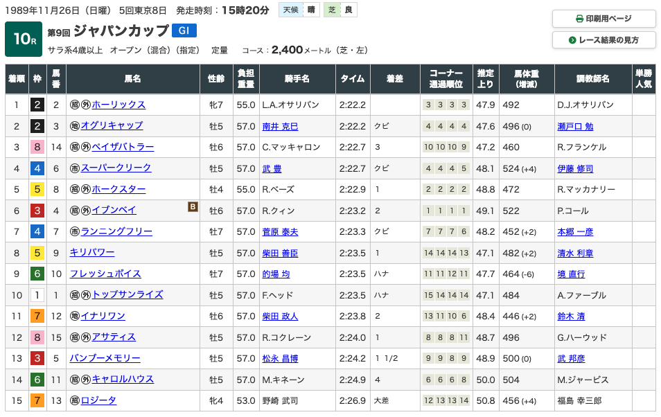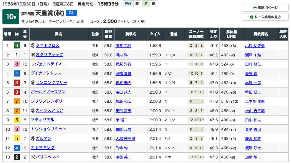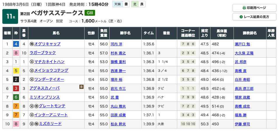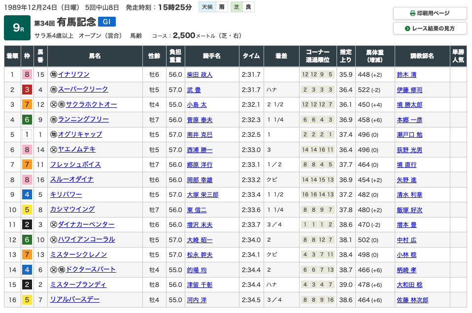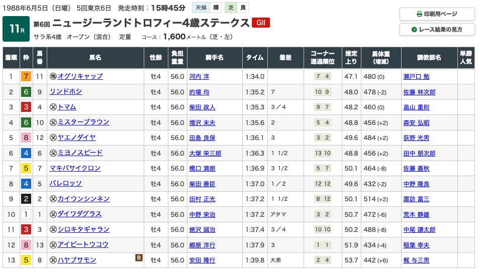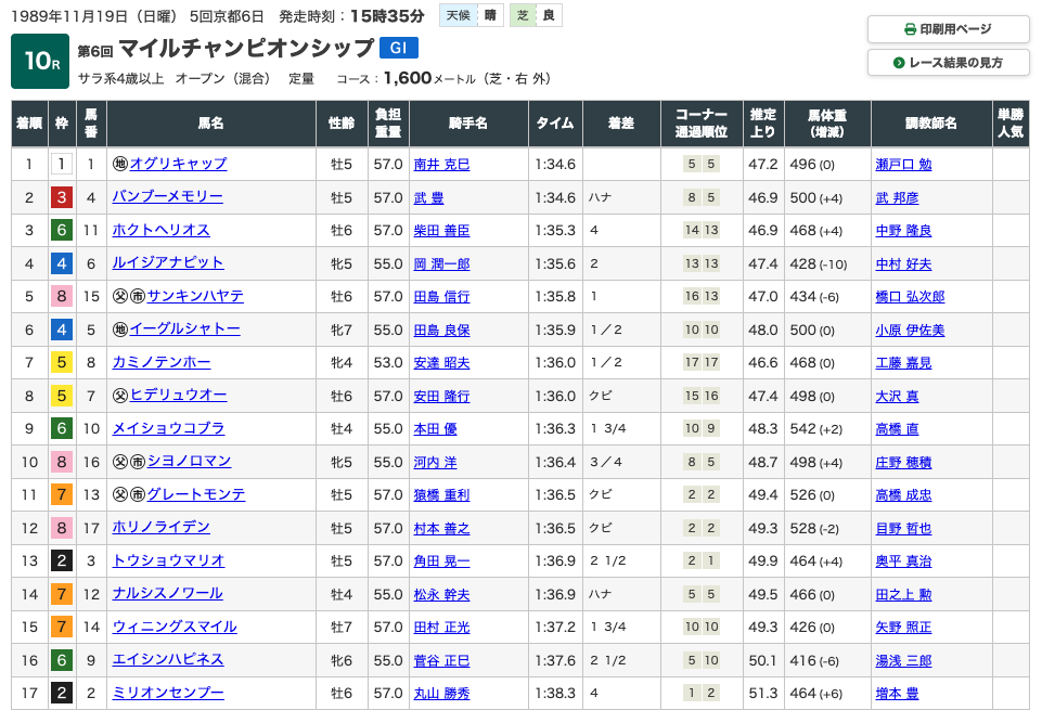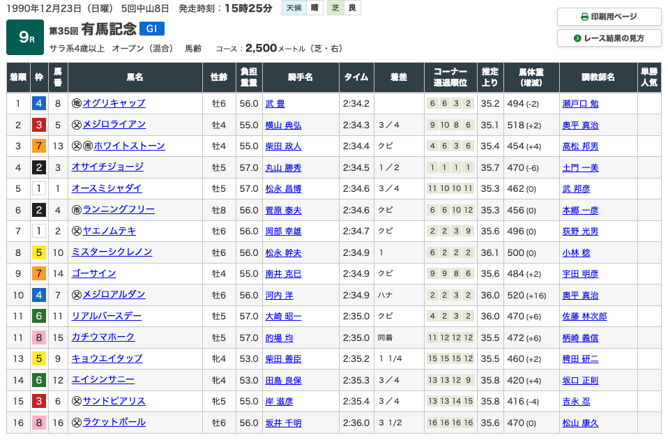 全て1着か2着という成績で終わり、いかにオグリキャップという競走馬が強かったのか、というのが分かります。