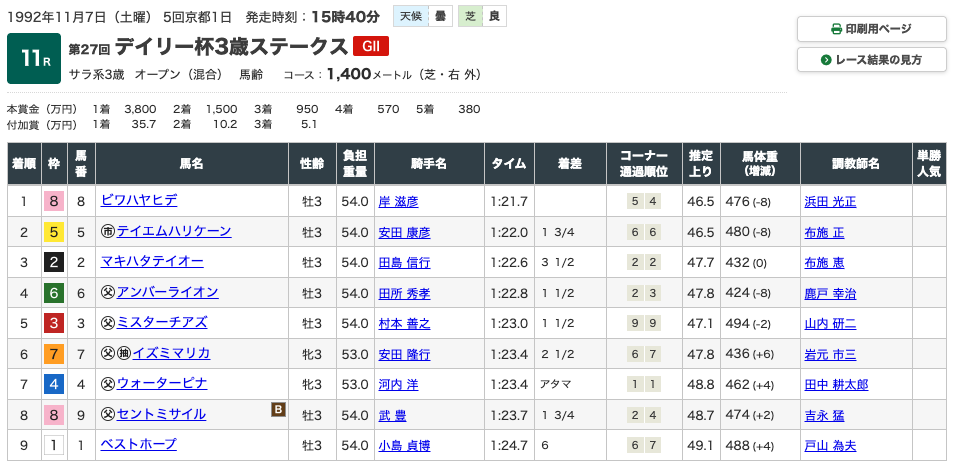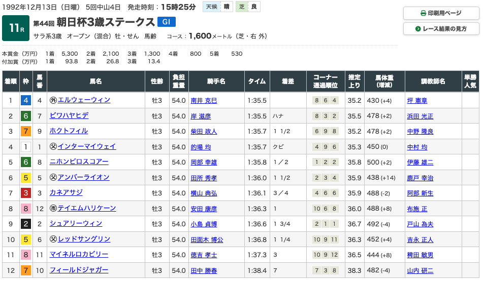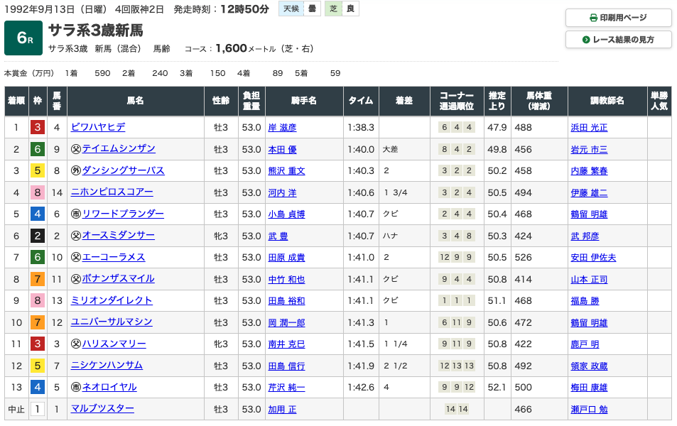実は1992年の時も1着と2着しか取っていないため、ビワハヤヒデは新馬戦から2着より下を取ったことがないのです。